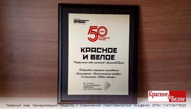 Недавно у нашей компании произошло знаменательное событие — сеть наших магазинов вошла в число победителей III сезона конкурса «50 легендарных брендов». Читатели «Комсомолки» признались в любви лучшим компаниям страны, достойным звания «всенародный, легендарный бренд». В списке номинантов были и рожденные в СССР, и новые предприятия, и компании, возникшие уже в последние десятилетия, но без которых жители нашей страны уже не мыслят свою реальность. В этом году на участие в конкурсе поступило около 2000 заявок, до этапа народного голосования дошло всего 97. И какова наша радость и, несомненно, гордость, что сеть магазинов «Красное & Белое» — один из этих всенародных любимчиков! Мы победили в номинации «Новые легенды». Неплохо правда? С удовольствием будет делать все и дальше, что вы выбирали наши магазины снова и снова!