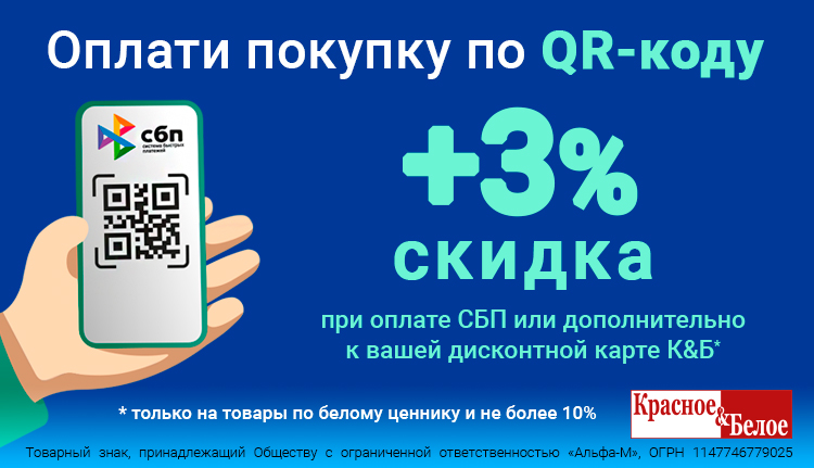 Теперь, оплачивая покупки по QR-коду Системы Быстрых Платежей, вы получаете 3% скидки на товары с белыми ценниками. А если вы являетесь обладателем дисконтной карты, то получаете +3% к вашей скидке, но не более 10%. То есть если скидка по дисконтной карте равна 8%, то, оплачивая товары по QR-коду, вы получите скидку в 10%. Если скидка по ДК уже равна 10%, то она не увеличится.