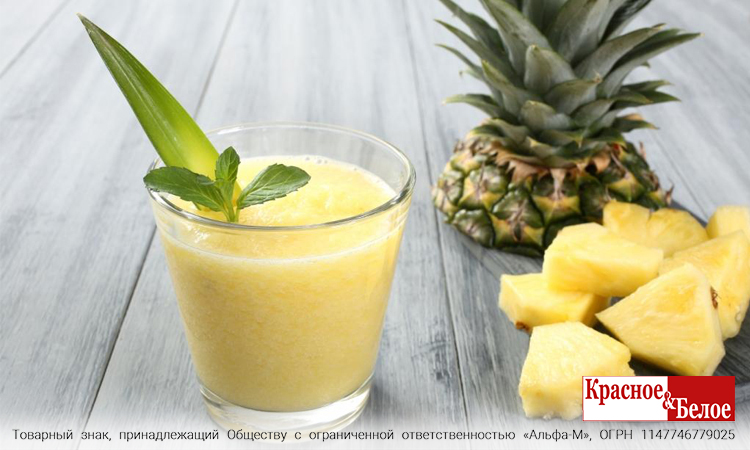 Тропический смузи. Кружочки сочного ананаса поместите в блендер, туда же налейте 100 мл молока и 100 мл сока «мультифрукт», взбейте все до однородного состояния. Листик мяты и кусочек ананаса в качестве украшения дополнят ваш коктейль!