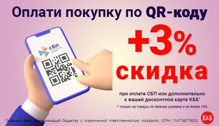 Покупки по QR-коду Системы Быстрых Платежей — просто и выгодно! Получайте скидку в 3% на товары с белыми ценниками. А если у вас есть дисконтная карта, то еще +3%, но не более 10%. Итак, если скидка по карте составляет 8%, то благодаря оплате по QR-коду вы получите скидку в 10%. Если скидка по ДК уже равна 10%, то она не увеличится.