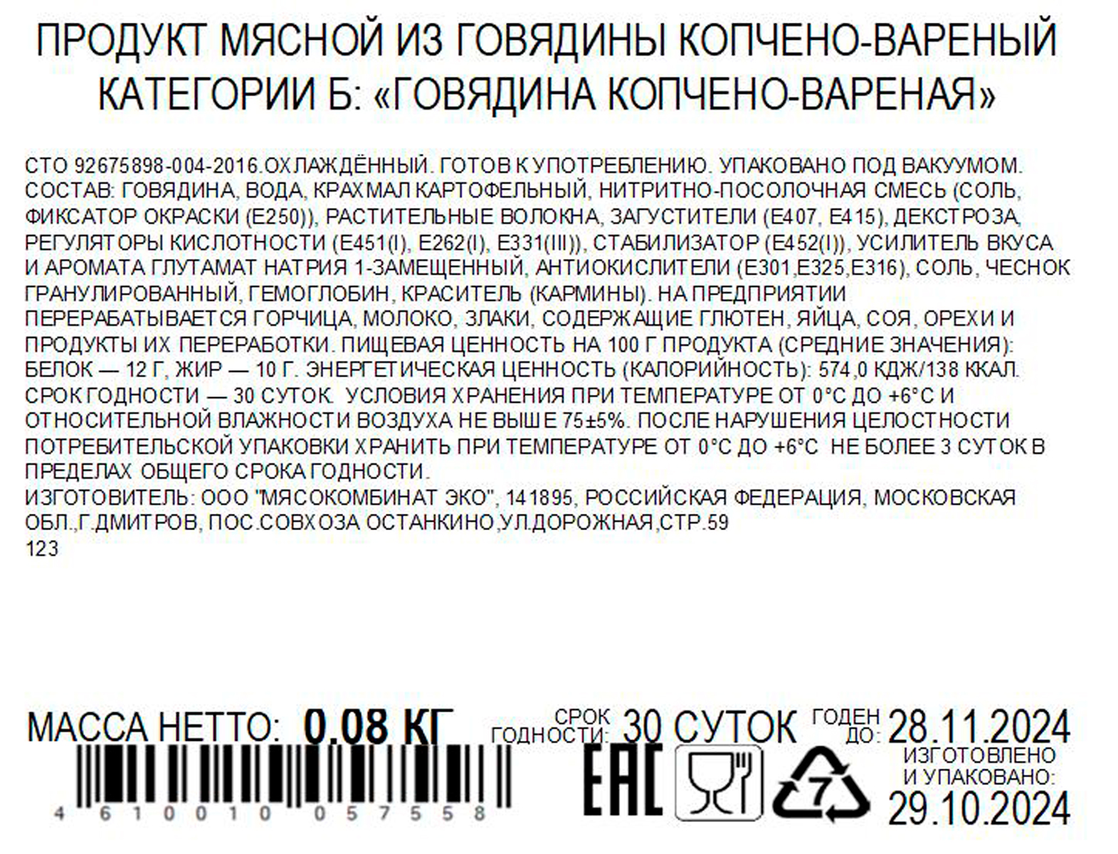 Говядина приготовлена из цельного куска мяса и нарезана на аккуратные слайсы. Обладает благородным вкусом и тонким ароматом копчения. Подойдёт для мясного ассорти, для приготовления салатов и холодных закусок.