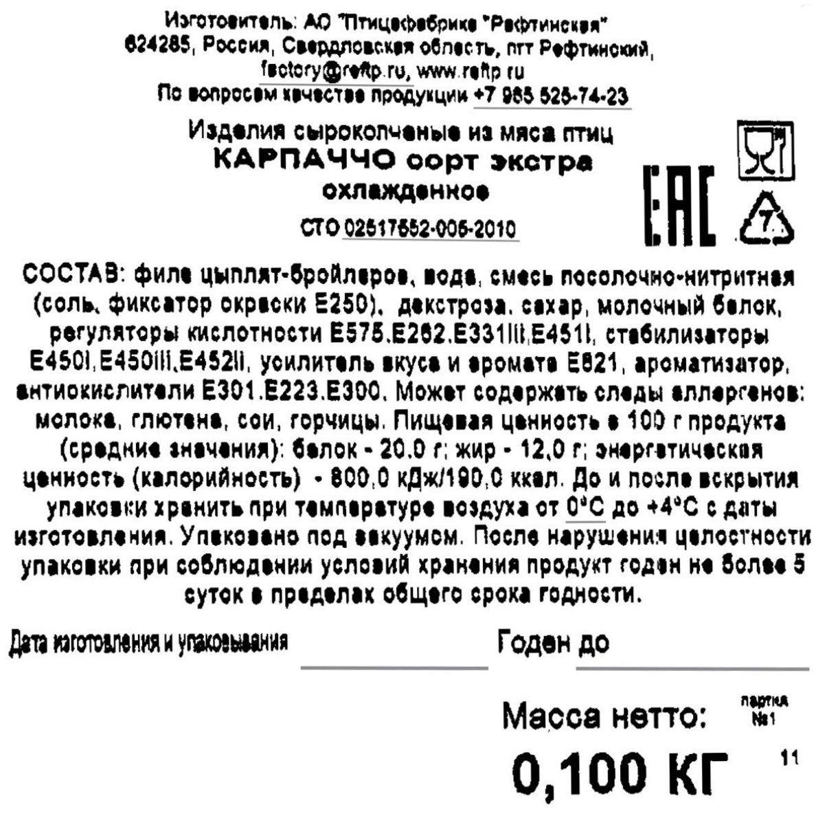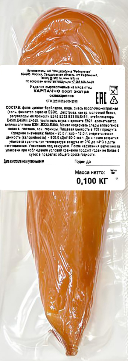 Карпаччо Рефтинская из мяса птицы сырокопчёное