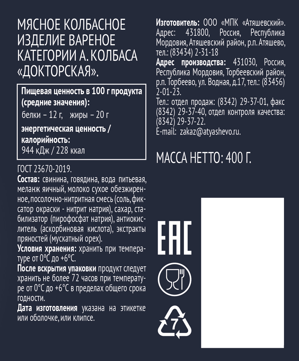 Колбаса Атяшево Докторская ГОСТ 400 г