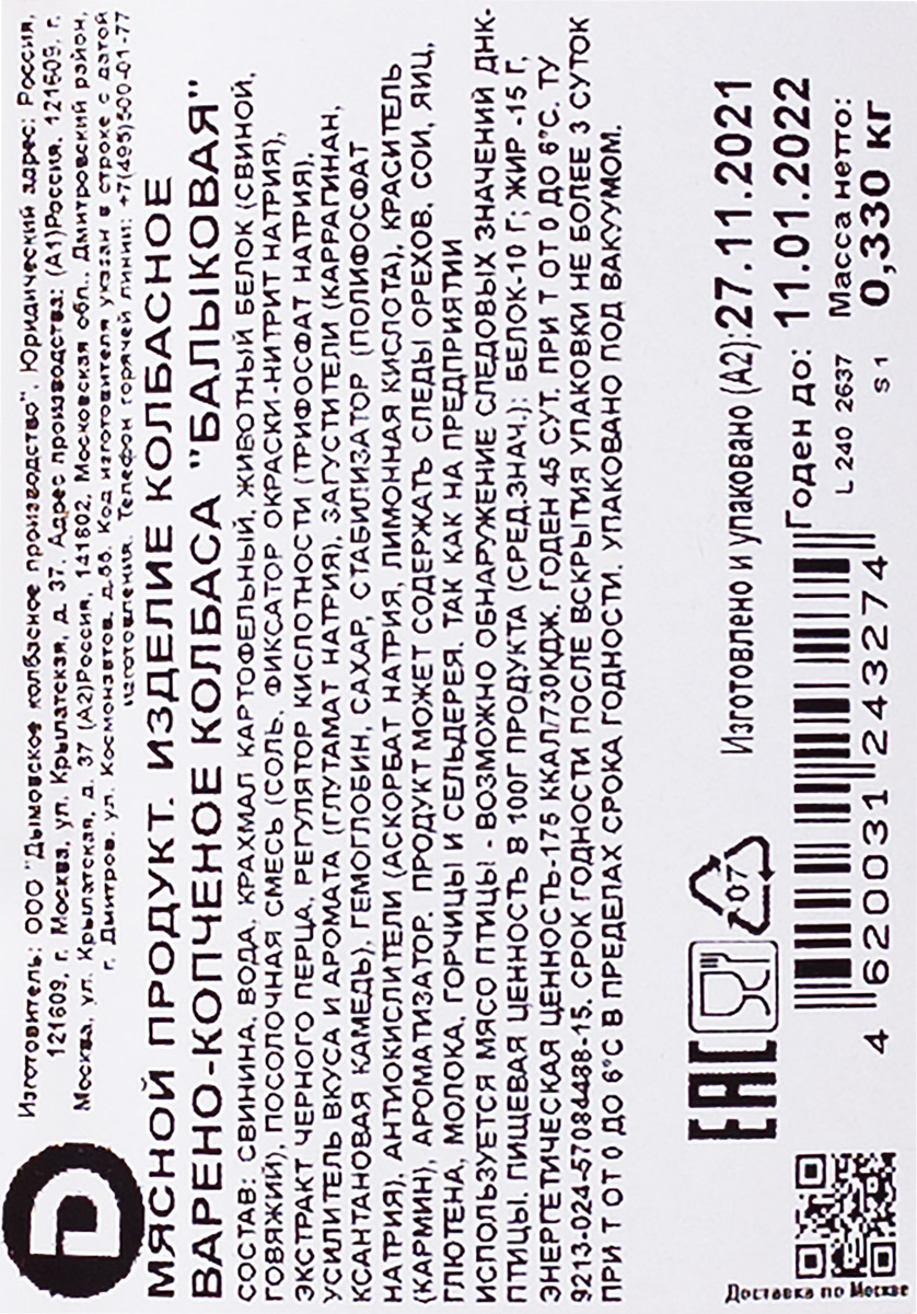 Колбаса Дымов Балыковая варено-копченая 330 г