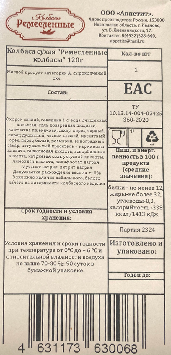Колбаса сухая «Ремесленные колбасы» получила свое название благодаря технологии, которая была заимствована у итальянцев в части алгоритма приготовления сухой колбасы. Минимум воды в фарше и практически отсутствие жира позволяют звучать палитре специй тоньше и изысканнее. Колбаса сухая прекрасно сочетается с вином и сладкими фруктами, создает воистину правильное гастрономическое сочетание. Покупая колбасу сухую «Ремесленные колбасы», вы получаете уверенность в том, что в ее составе только качественное мясо и уникальный набор специй. Откройте для себя мир ремесленных колбас!