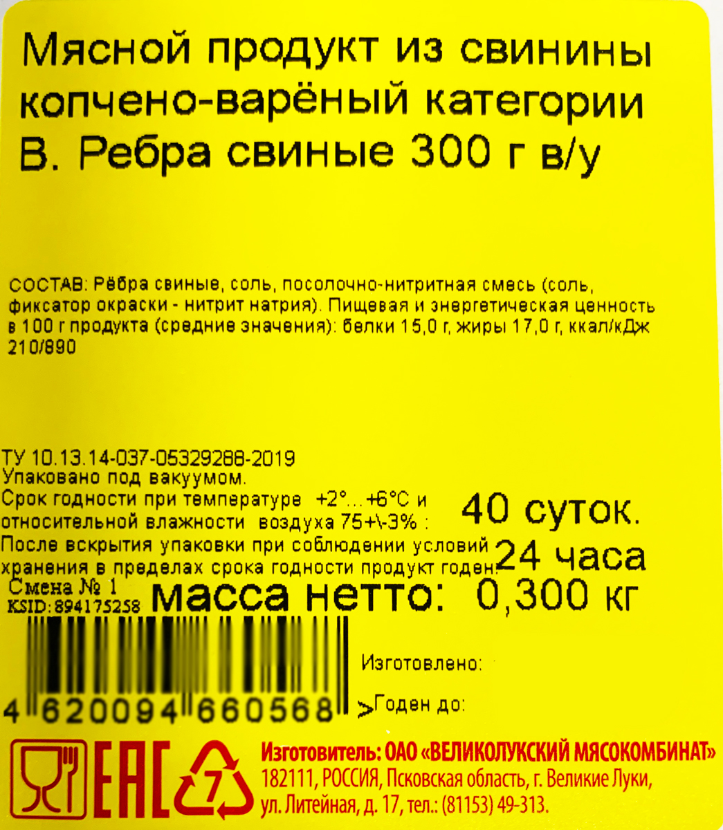 Великолукский мясокомбинат Свиные ребра