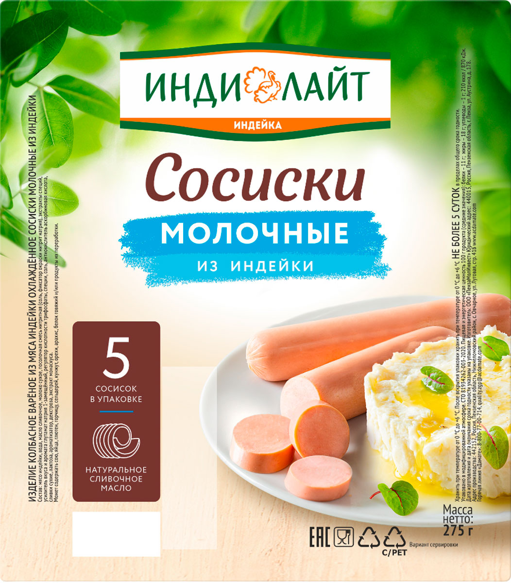 Молочные сосиски «Индилайт» изготовлены из 100% мяса индейки с добавлением натурального сливочного масла, которое делает их вкус более сочным и нежным, а еще оставляет приятное сливочное послевкусие. Эти сосиски отлично подходят в качестве самостоятельного блюда и прекрасно сочетаются с картофелем и свежими овощами.