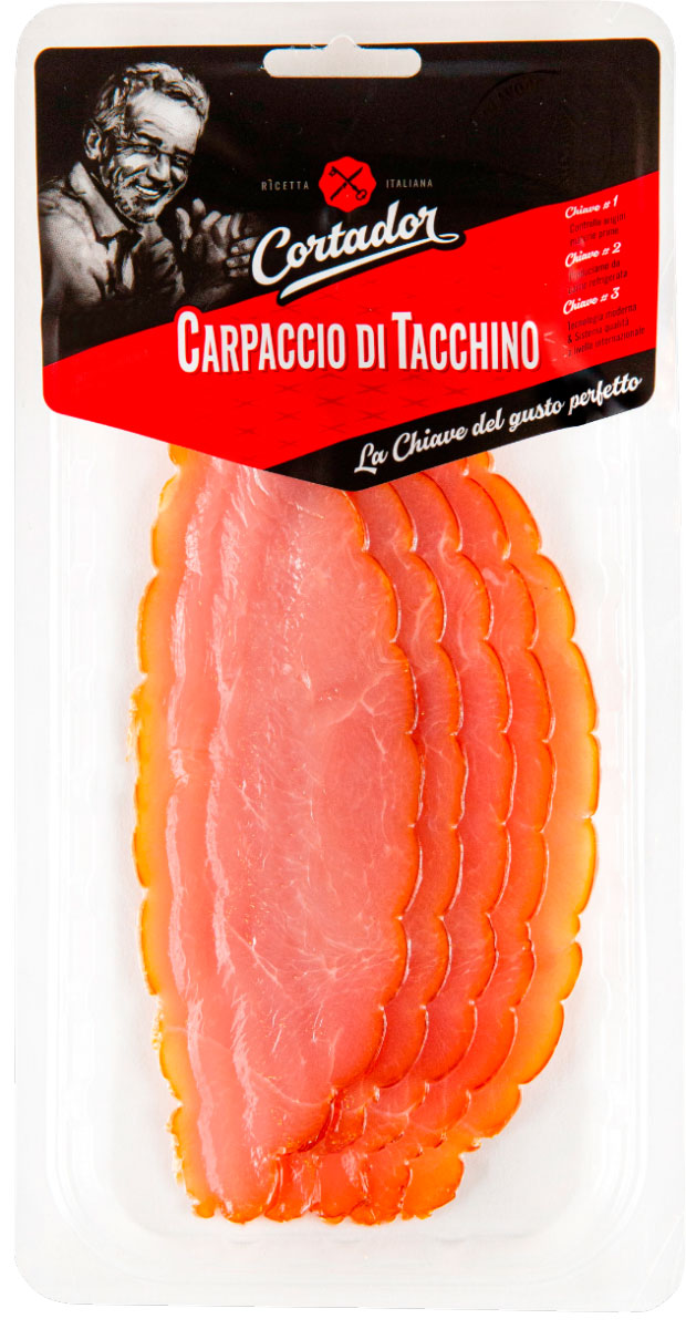 Carpaccio di Tacchino – классический сырокопчёный мясной деликатес из филе грудки индейки. Натуральные специи придают насыщенный вкус с перечной нотой, который сочетается с лёгким ароматом натурального копчения. Тонко нарезанное нежное филе займёт достойное место в составе мясных тарелок и брускетт, а также станет изюминкой в лёгких салатах.