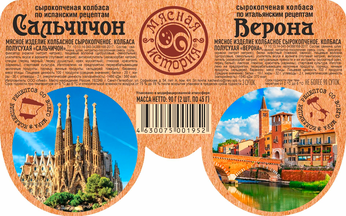 Сырокопченые колбасы «Мясная история» — это коллекция изысканных, лучших рецептов, многолетний труд и традиции мастеров со всего мира. Прекрасное сочетание двух гастрономических культур, дуэт разных вкусов Испании и Италии в одной упаковке: бесподобный Сальчичон в гармонии с благородной колбасой Верона. Безупречный, сочный и ароматный Сальчичон с красивым структурным рисунком на срезе невозможно ни с чем перепутать. Мелкозернистая колбаса Верона удивит превосходным мягким вкусом с нотками белого перца. Попробовав Верону, вы ощутите атмосферу одного из самых романтичных мест мира, знаменитого древними достопримечательностями, старинными улочками и чарующей архитектурой. Сальчичон и Верона – сырокопченые колбасы из отборного мяса с неповторимым букетом специй. Идеальное решение для мясной тарелки к любимому напитку.