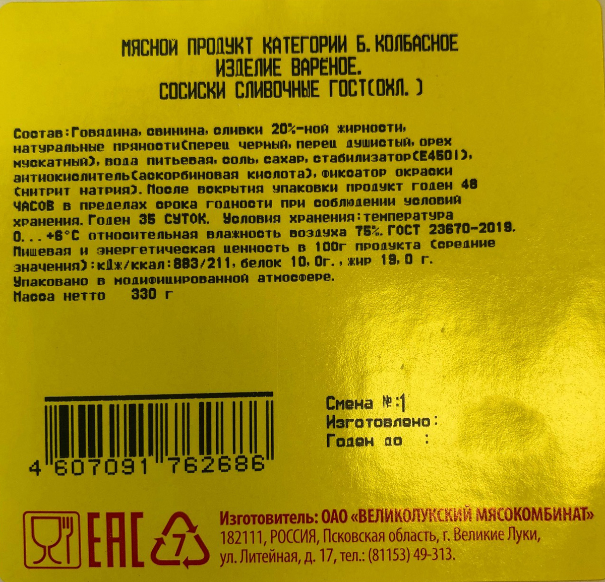 Сосиски Великолукский мясокомбинат Сливочные ГОСТ