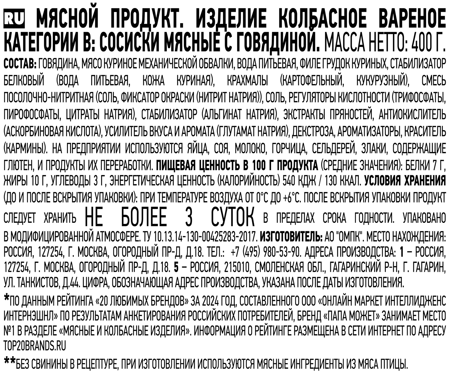 Сосиски «Папа Может» изготовлены из натурального мяса говядины и куриных грудок, что делает их вкус насыщенным и сбалансированным. Они отлично подойдут к любому гарниру. Также их можно варить, жарить или приготовить на пару.