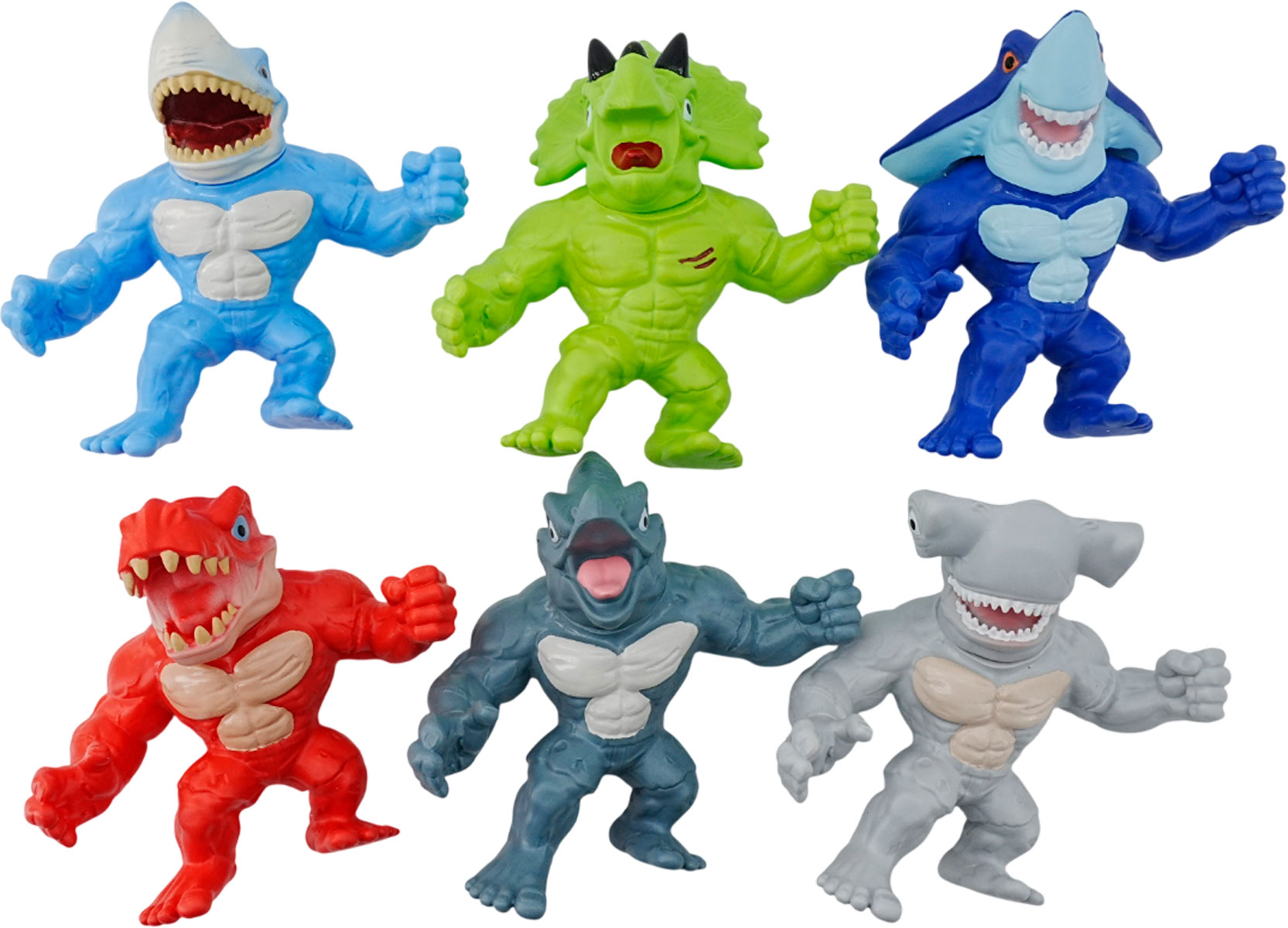 Готовы к встрече с настоящими гигантами? Встречайте «Мегамонстров», которых можно мять, тянуть и сражаться с ними снова и снова! Шарки — океанское существо, которое теперь в ваших руках. Этот грозный хищник готов к любым испытаниям. Молотус — неукротимая сила природы в гибком воплощении. Почувствуйте его мощь! Акулонг — сочетание остроты акулы и ярости дракона. Этот монстр не оставит равнодушным никого. Диностронг — древний ящер, чья сила способна сокрушить любые преграды. Тирекс — король динозавров в новой, гибкой интерпретации. Его грозный вид скрывает удивительную податливость. Трицерокс — мощный и неуступчивый трёхрогий гигант, который станет вашим надёжным союзником. Сражайтесь, тяните, мните! Выберите своего монстра и почувствуйте, как мощь становится гибкой!
