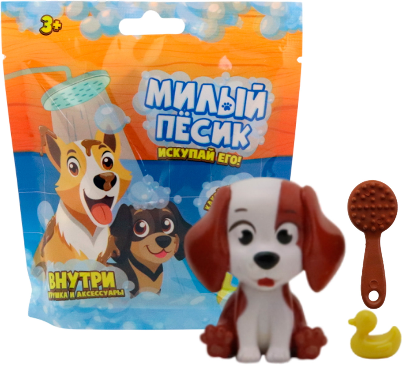 Игрушка «Милый пёсик» в ассортименте. Познакомьтесь с очаровательным щенком, который очень любит купаться! Игрушка покрыта специальной краской с эффектом «грязи». Искупайте питомца в тёплой воде, и он станет чистым и аккуратным. В наборе с собачкой идут 2 аксессуара: мини-уточка для купания и щётка. Узнайте, какой именно щенок попадётся вам! Внимание! Краска может оставлять следы на одежде.