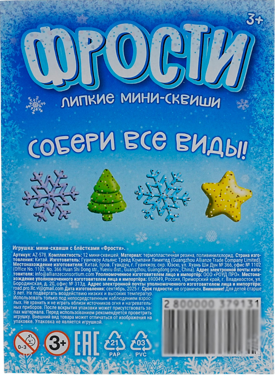 Липкие мини-сквиши «Фрости» — праздничная коллекция для волшебного настроения! В серии представлено 4 вида дизайнов: снежинки, ёлочка и звёздочка. Все украшены блёстками, что придаёт игрушкам сияющий, праздничный вид. Набор состоит из 12 мини-сквишей одного вида — собирайте разные варианты, чтобы собрать полную коллекцию! Игрушки светятся в темноте, добавляя игре волшебства и ярких впечатлений. Сквиши липкие и лёгкие: их можно бросать на гладкие поверхности, и они будут прилипать, делая игру ещё веселее. Отличный вариант для подарков и праздничных сюрпризов!