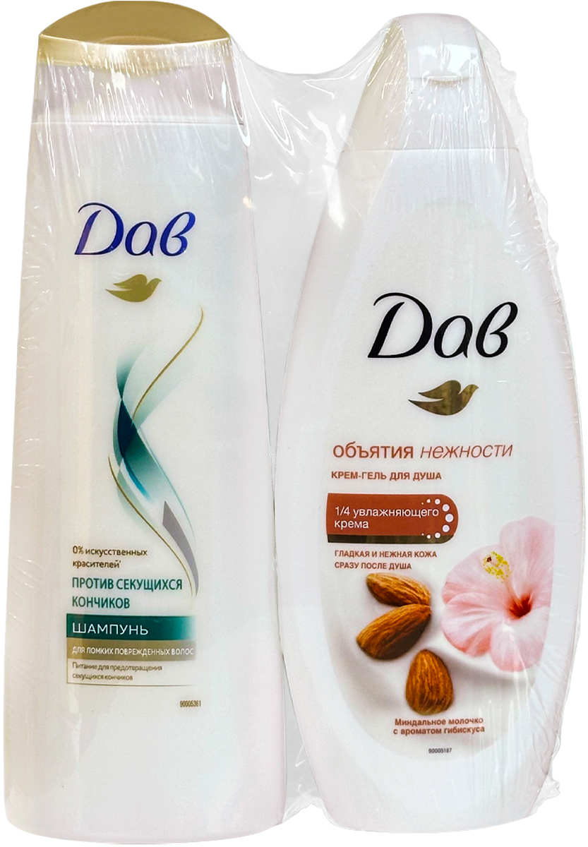 Шампунь Dove Hair Therapy укрепляет волосы, а также интенсивно питает, предотвращая сечение кончиков. Подходит для ежедневного применения. Крем-гель для душа Dove «Объятия нежности» с миндальным молочком и утонченным ароматом гибискуса подарит вашей коже ощущение гладкости.
