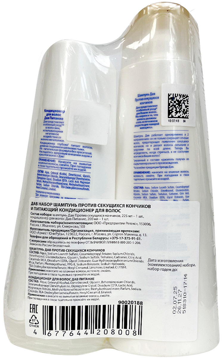 Шампунь Dove Hair Therapy укрепляет волосы, а также интенсивно питает, предотвращая сечение кончиков. Подходит для ежедневного применения. Кондиционер Care+ от Dove обеспечивает глубокое питание волос, делая их гладкими и шелковистыми.