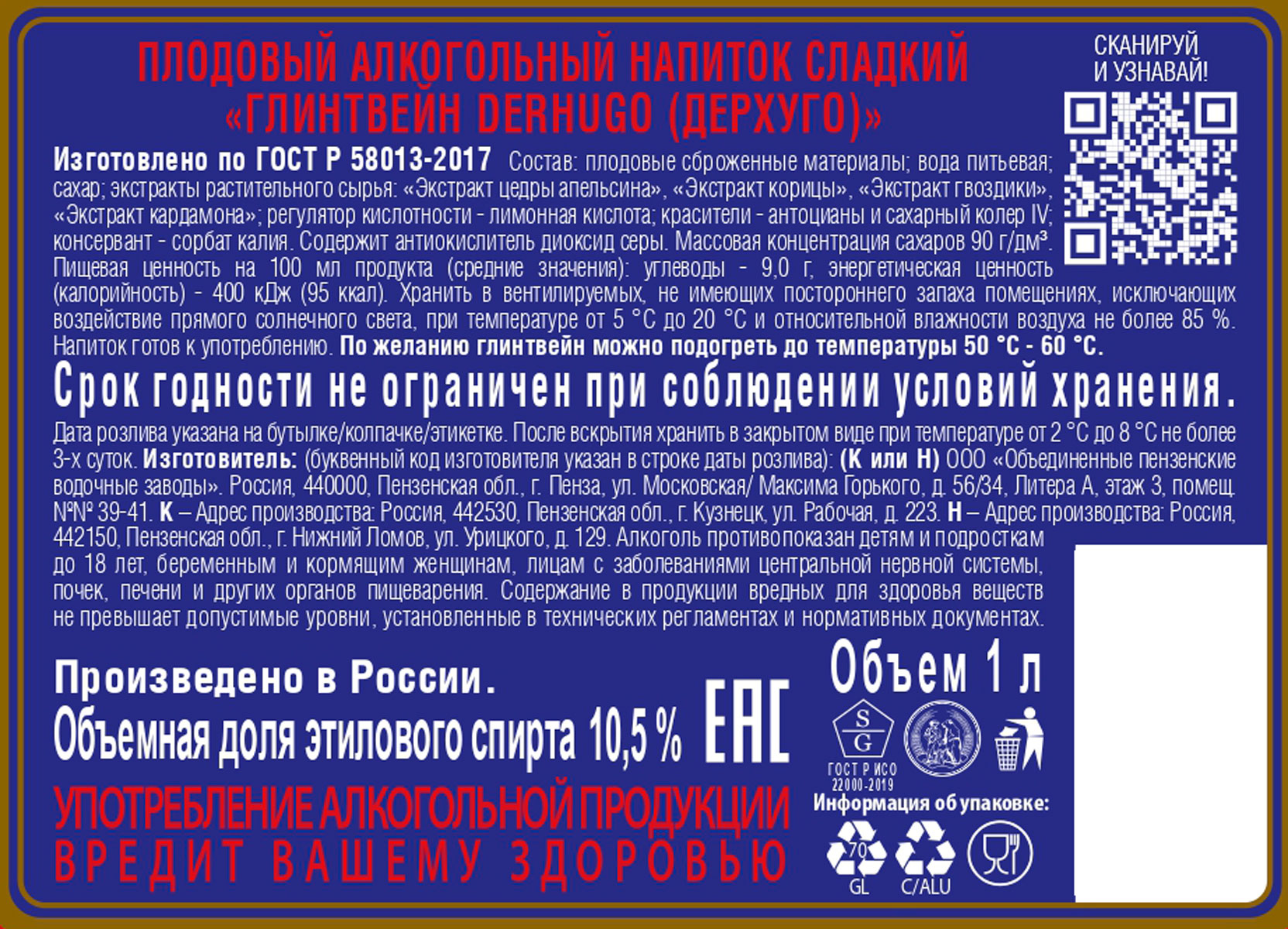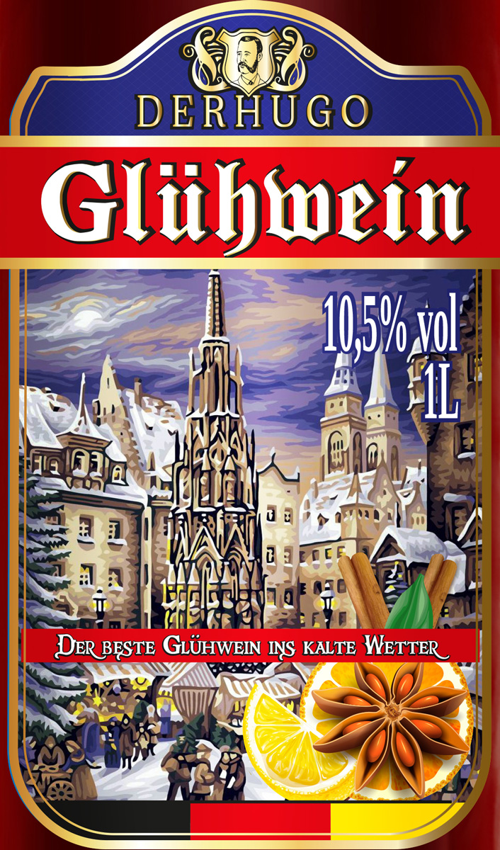 Глинтвейн DERHUGO — алкогольный напиток, который производится по классическому немецкому рецепту. Обладает нотами душистых специй и цитрусовых. Глинтвейн принято употреблять в горячем виде, но ни в коем случае нельзя доводить до кипения, иначе он мгновенно потеряет все свои вкусовые качества и большую долю алкоголя. Прекрасно сочетается с мясом гриль, шашлыком, дичью, особенно приготовленными на открытом огне, а также со сладостями или выпечкой.
