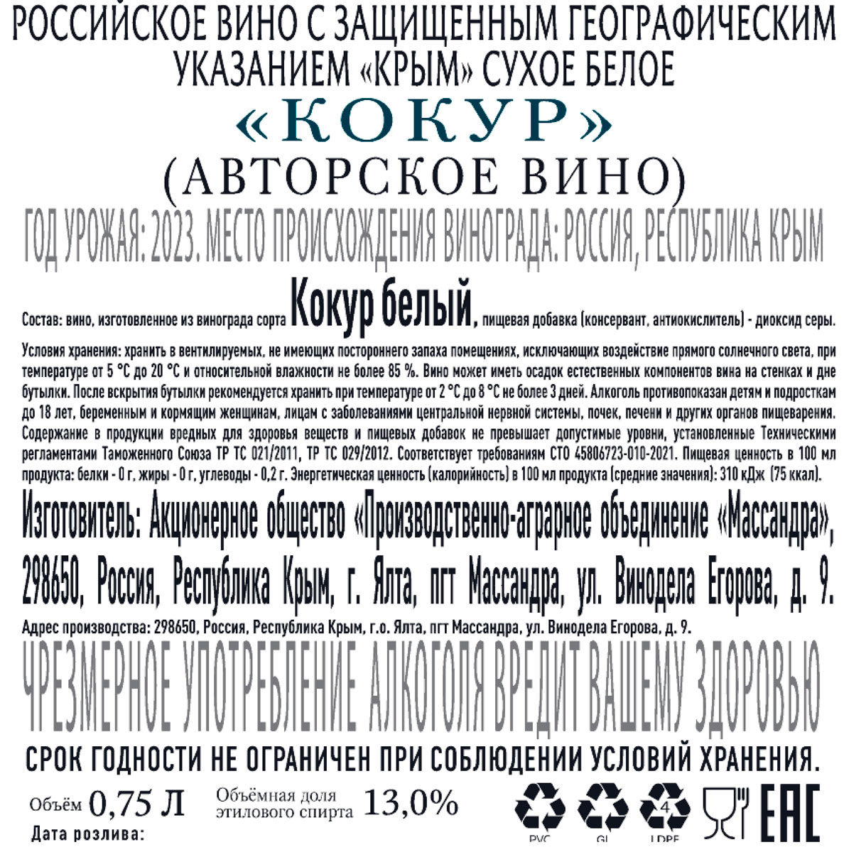Вино авторское Массандра Кокур белое сухое 0,75 л