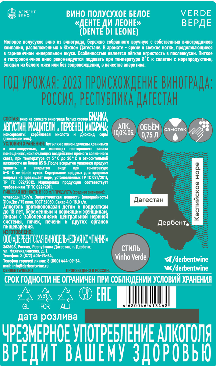 Вино Денте ди Леоне Верде белое полусухое 0,75 л