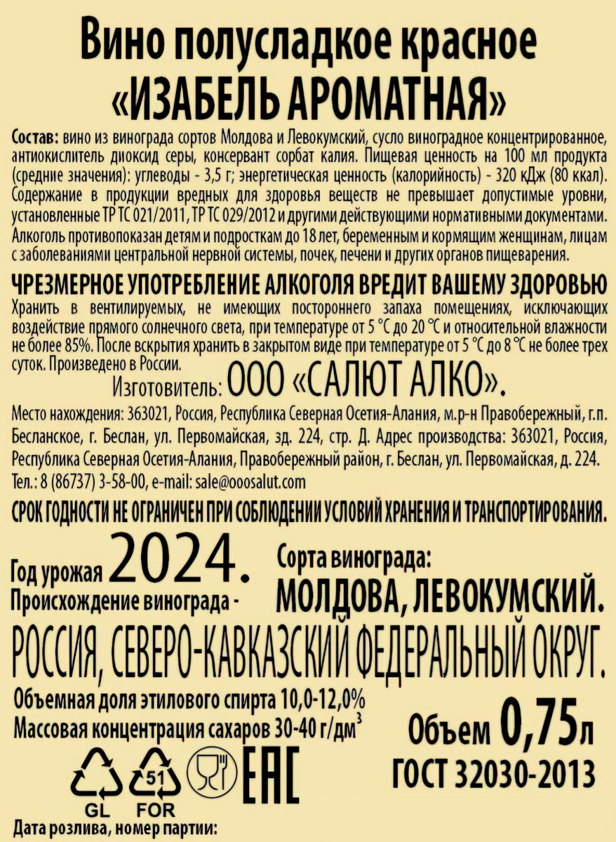 Вино Изабель Ароматная красное полусладкое 0,75 л