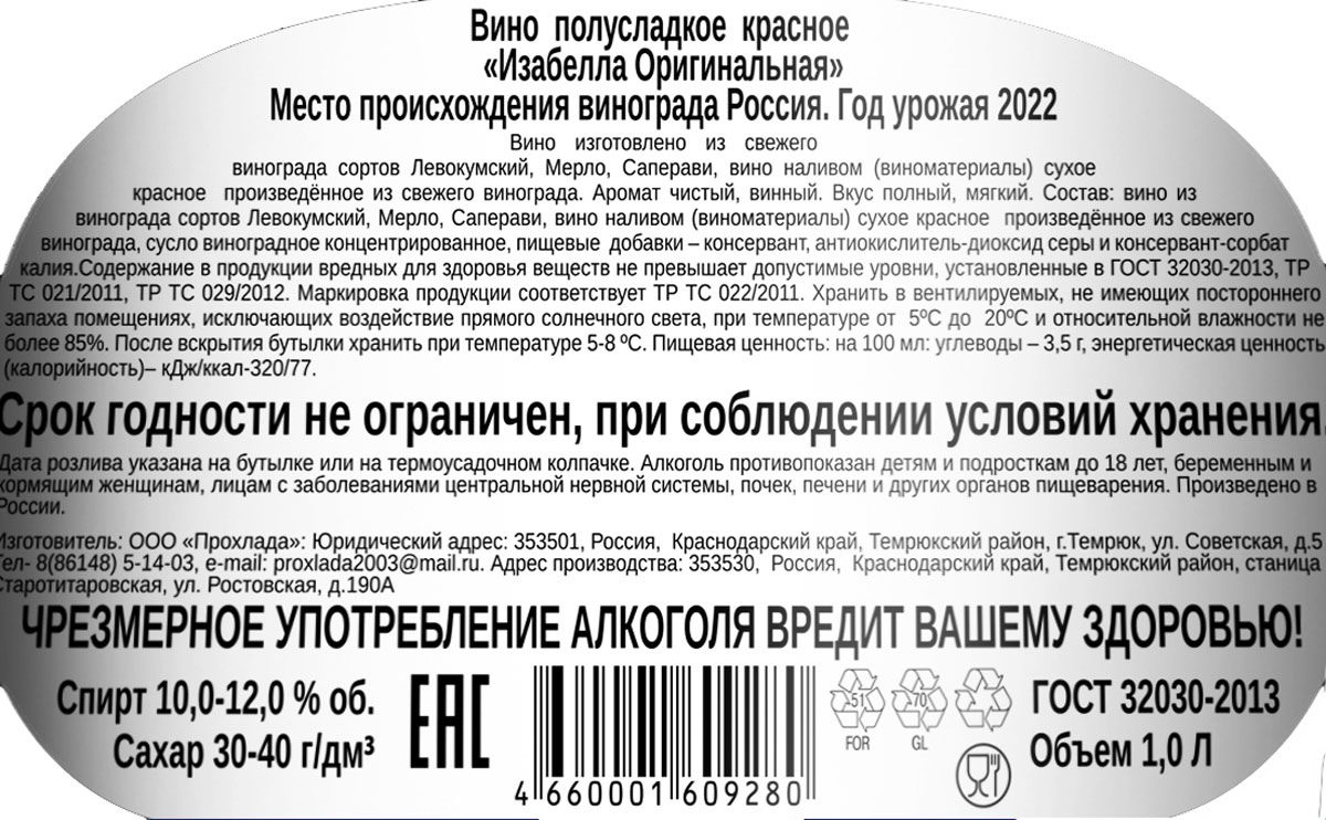 Вводят в заблуждение названием вина. В составе нет сорта винограда Изабелла.