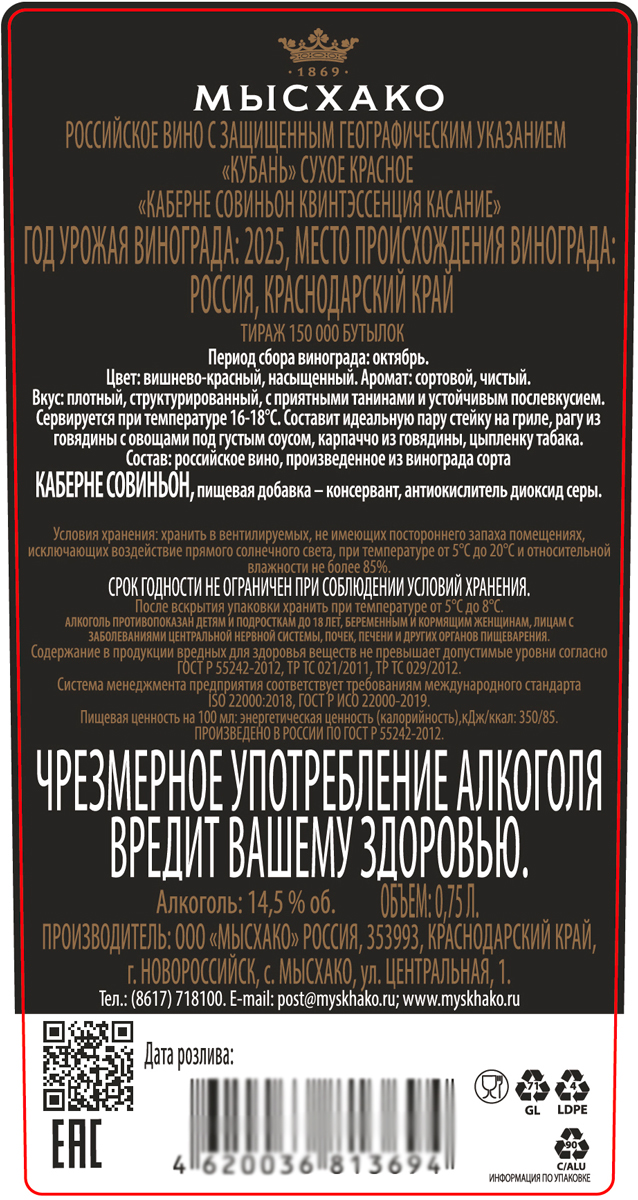 Вино Квинтэссенция Касание Каберне Совиньон красное сухое 0,75 л