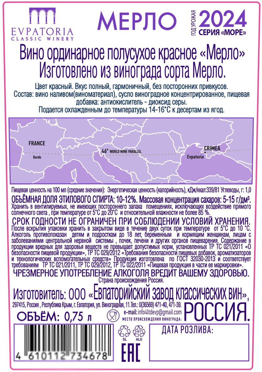 Evpatoria Classic Winery Мерло полусухое красное