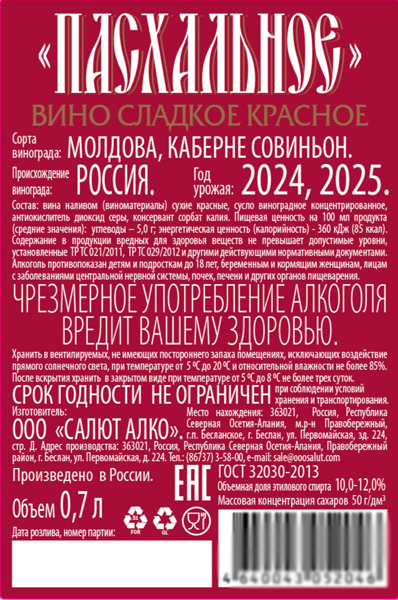 Вино Пасхальное красное сладкое 0,7 л