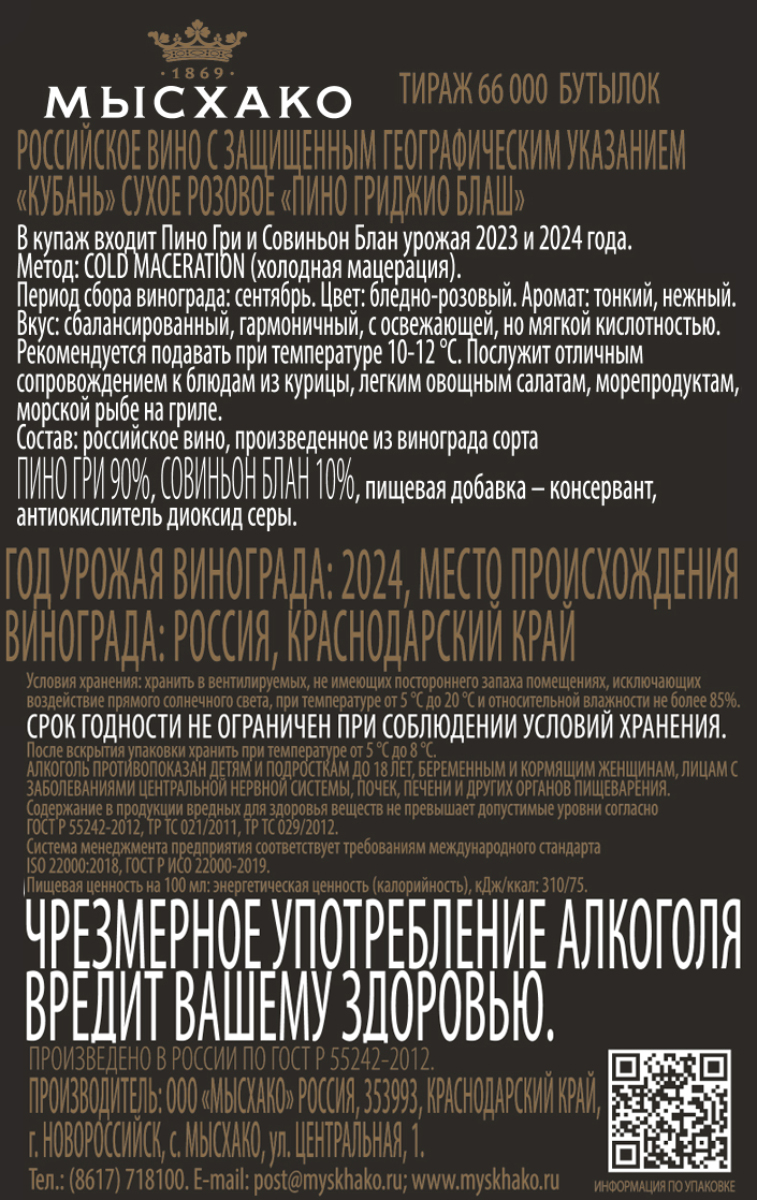 Вино бледно-розового цвета произведено с использованием метода холодной мацерации из винограда сортов Пино Гри и Совиньон Блан урожая 2023 и 2024 года. Обладает тонким, нежным ароматом и сбалансированным, гармоничным вкусом с освежающей, но мягкой кислотностью. Отлично сочетается с блюдами из курицы, легкими овощными салатами, морепродуктами, морской рыбой на гриле. Рекомендуемая температура подачи: 10–12 °С.