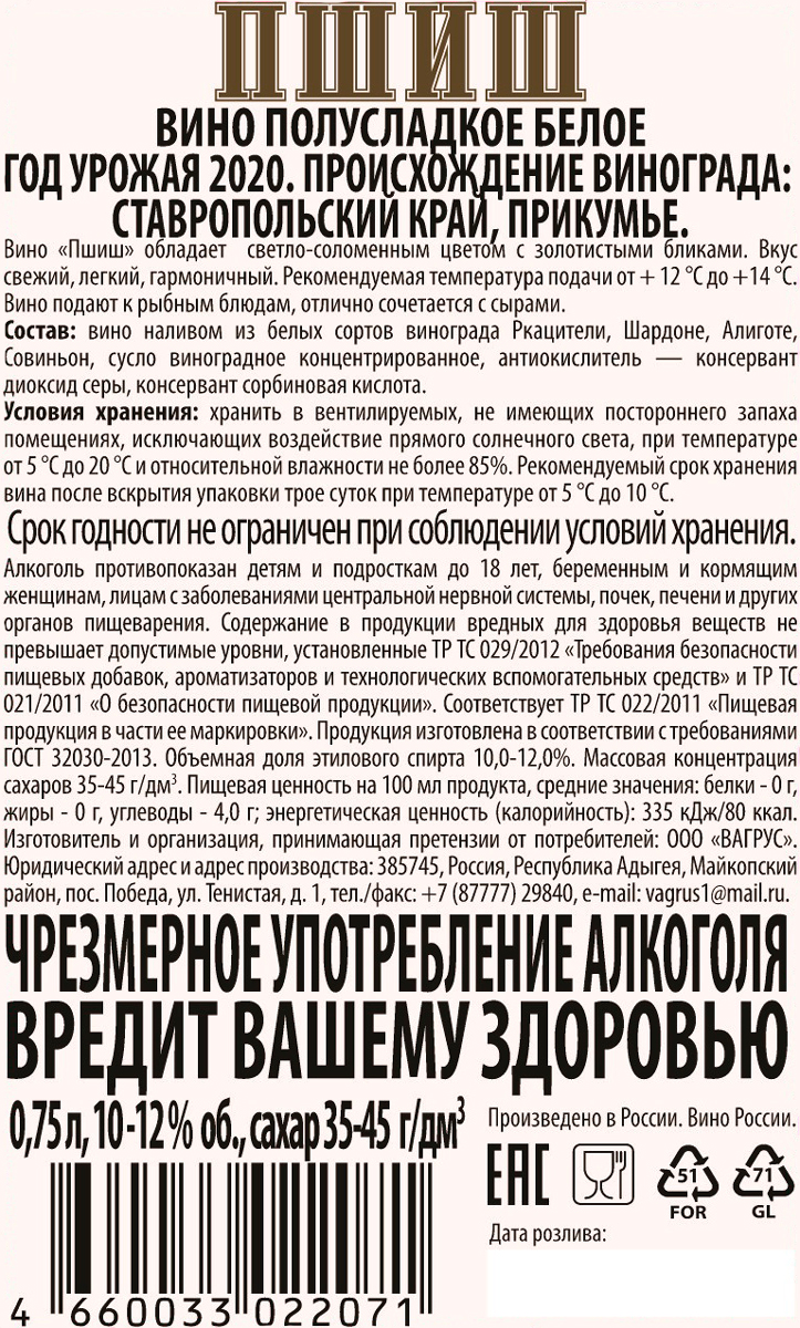 Вино полусладкое белое Пшиш