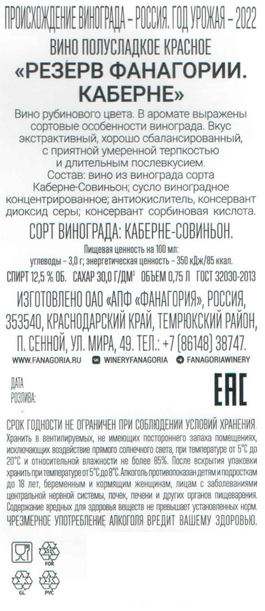 Вино Резерв Фанагории Каберне красное полусладкое 0,75 л