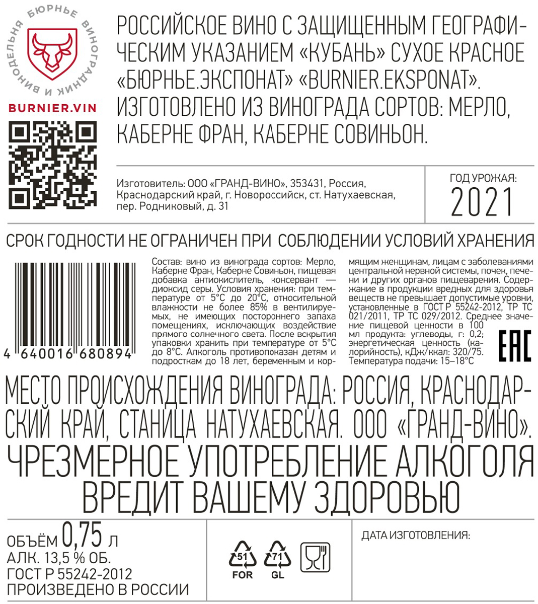 Вино российское Бюрнье Экспонат красное сухое 0,75 л