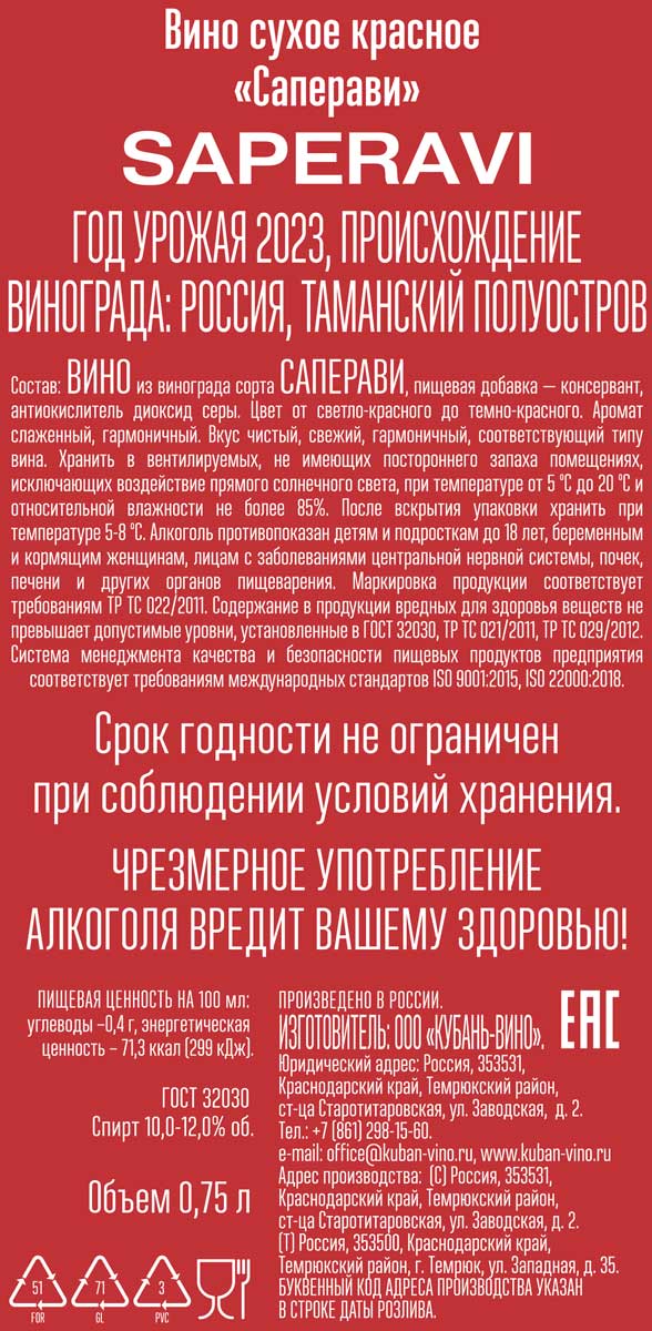 Вообще на саперави не похоже, цвет, вкус не соответствуют. Никакой терпкости как должно быть у саперави. Будто разбавленное водой. От Кубань-вино ожидалось большего даже за такую цену. Уж не писали бы гордое "саперави".