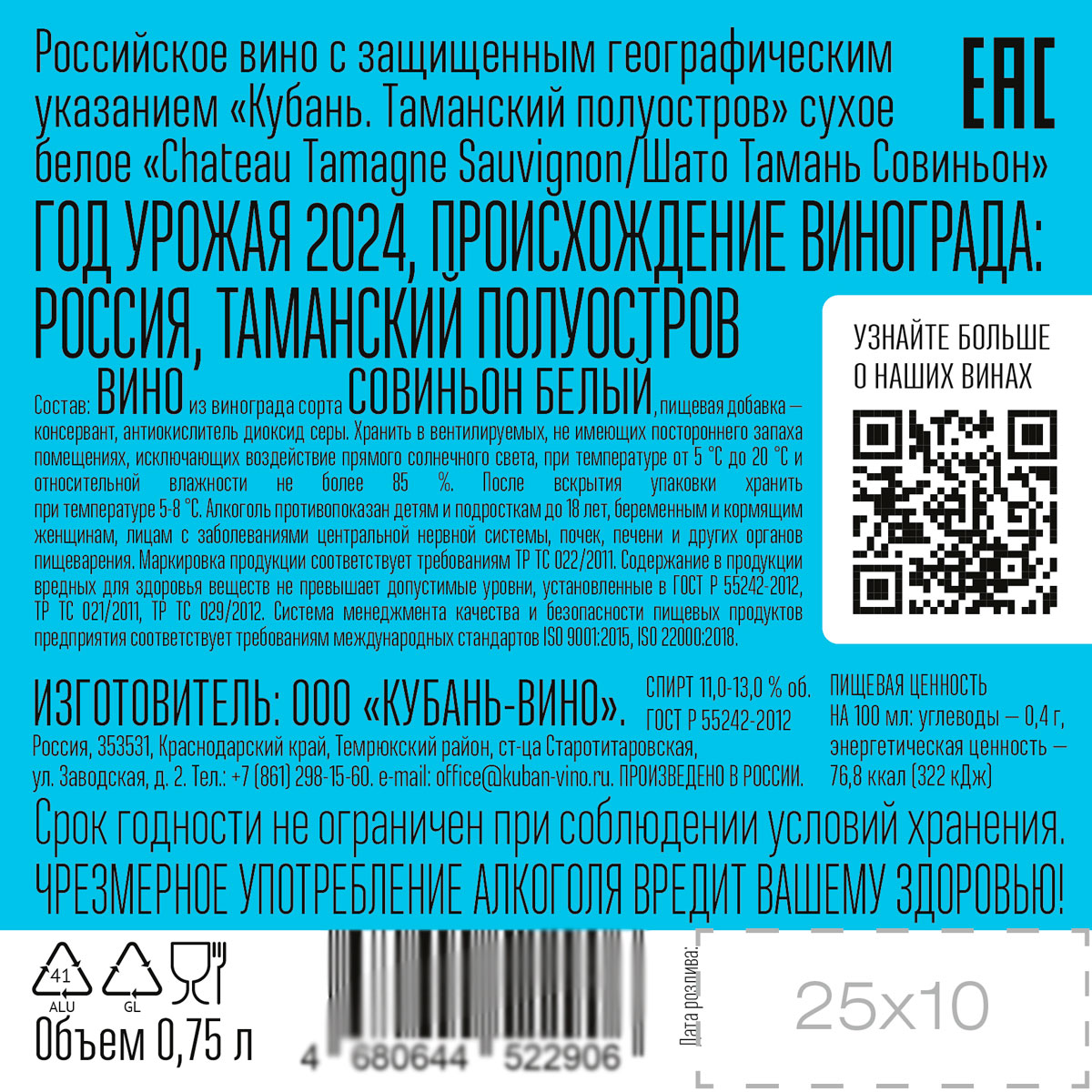 Вино Шато Тамань Совиньон белое сухое 0,75 л