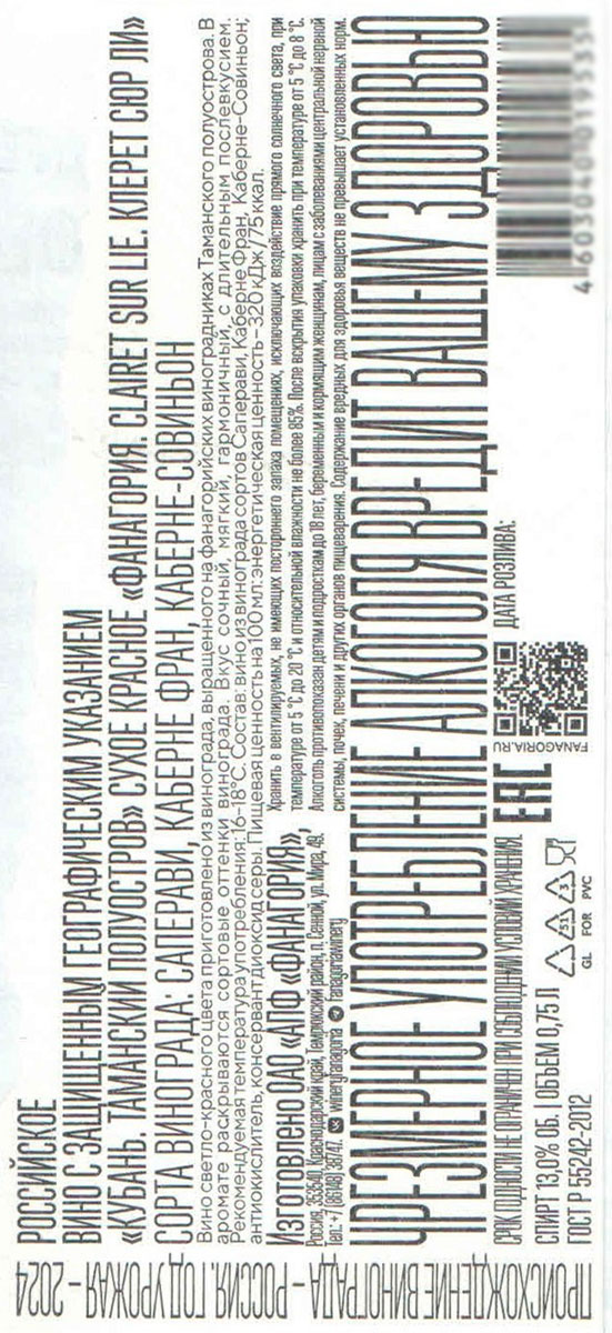 Вино Фанагория Клерет Сюр Ли красное сухое 0,75 л