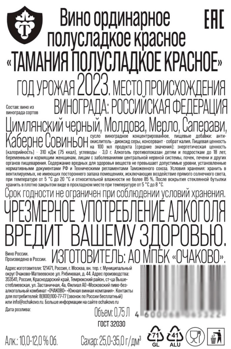 Вино Тамания красное полусладкое 0,75 л