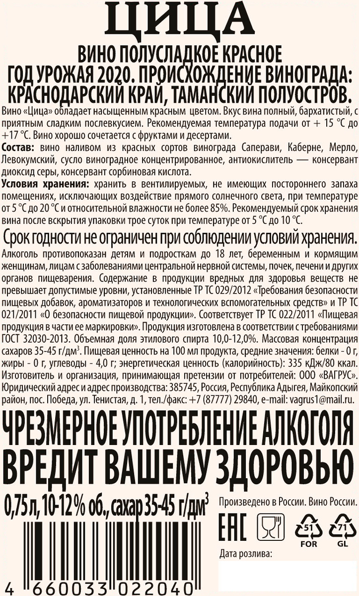 Красное полусладкое вино «Цица» обладает насыщенным темно-вишневым цветом. Вкус вина полный, с приятным сладким послевкусием. Букет с выраженными нотками сорта «Изабелла» и земляничным оттенком. Вино хорошо сочетается с фруктами и десертами. Рекомендуемая температура подачи: +15-17 °С.