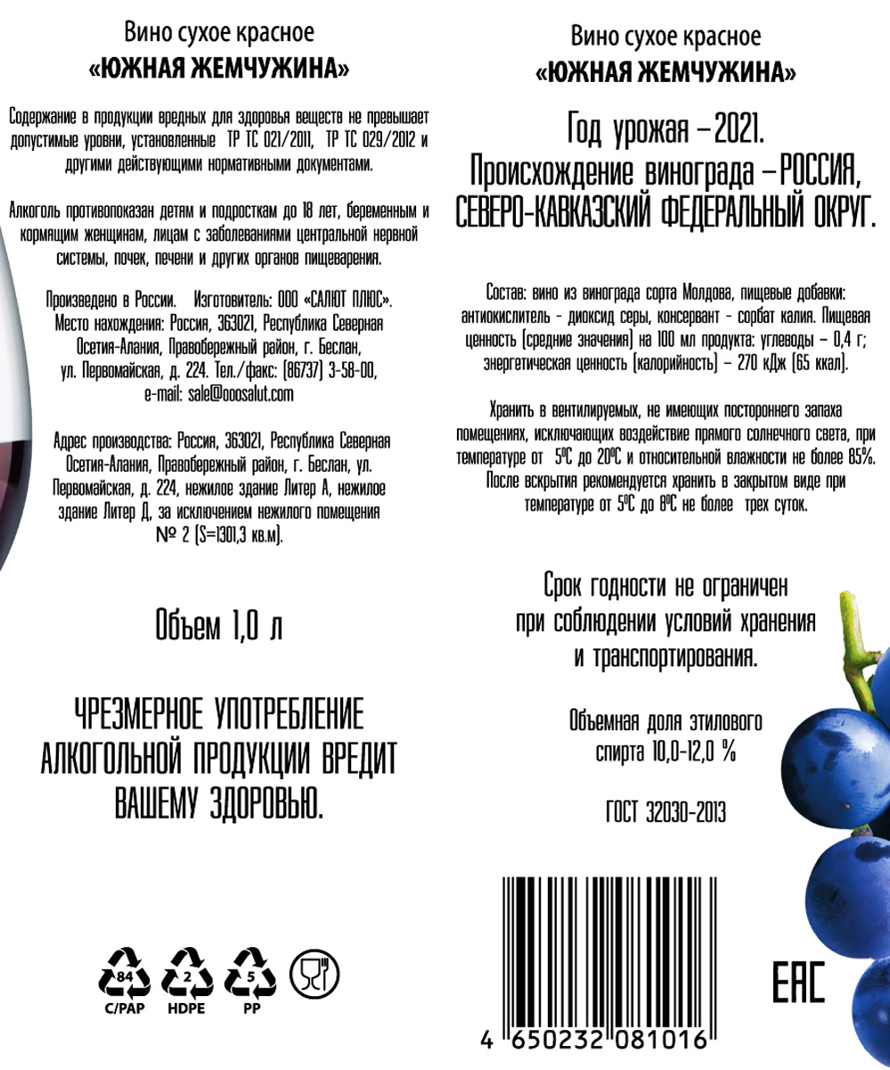 Южная Жемчужина красное сухое