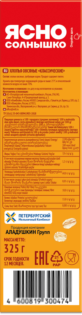 Хлопья овсяные классические «Ясно Солнышко» производятся из резаной овсяной крупы, обработанной по уникальной технологии сохранения зародыша зерна. Растворимые и нерастворимые пищевые волокна нормализуют пищеварение и дарят чувство сытости на длительное время. Это 100% натуральный и удобный продукт быстрого приготовления, в котором сохранилась вся польза и питательная ценность цельных злаков и природных отрубей.