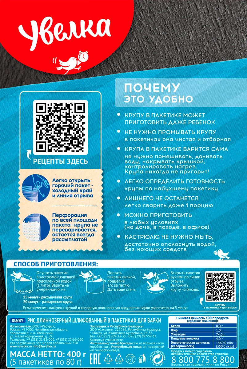 Рис Увелка длиннозерный в пакетиках для варки 400 г