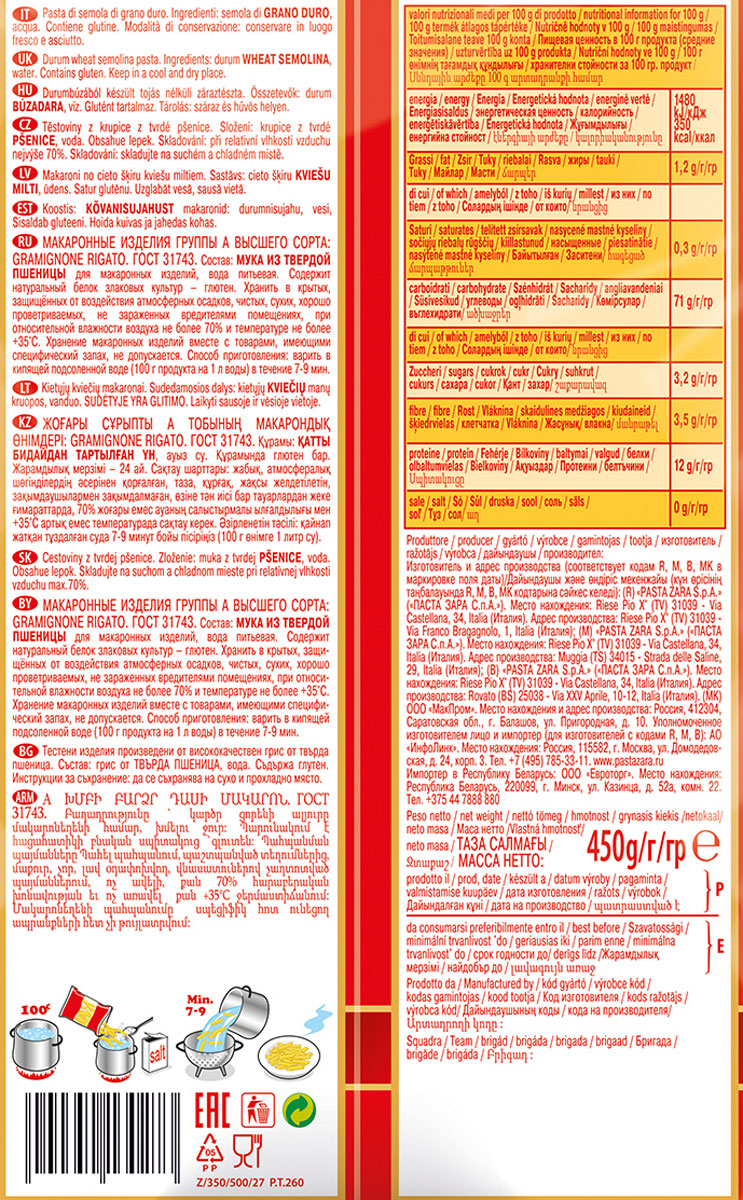 Рожки рифленые Pasta Zara № 027 сочетают в себе современность технологий производства и традиционное итальянское качество. Рожки рифленые прекрасно подходят для приготовления блюд с разнообразными соусами, сыром, мясом или овощами — все ограничивается только вашей фантазией! Мука из твердых сортов пшеницы не дает макаронам развариваться и сохраняет форму изделия. Обновленный современный дизайн делает пачку заметной на полке. Пачку стало еще удобнее размещать вертикально на полках сети, ее удобно держать в руках и хранить на кухне.