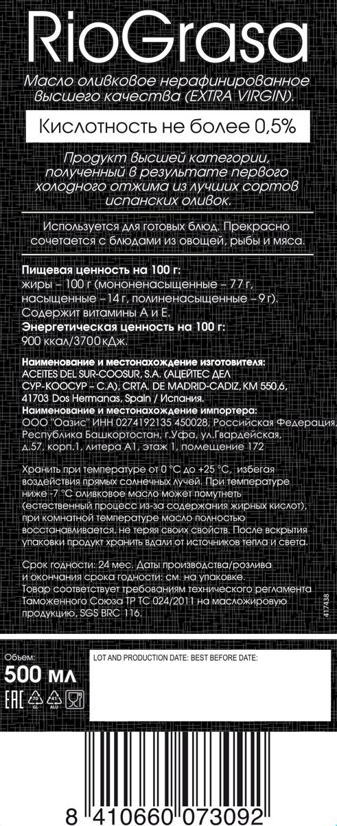 Масло оливковое RIOGRASA Extra Virgin Oil Olive нерафинированное 0,5 л