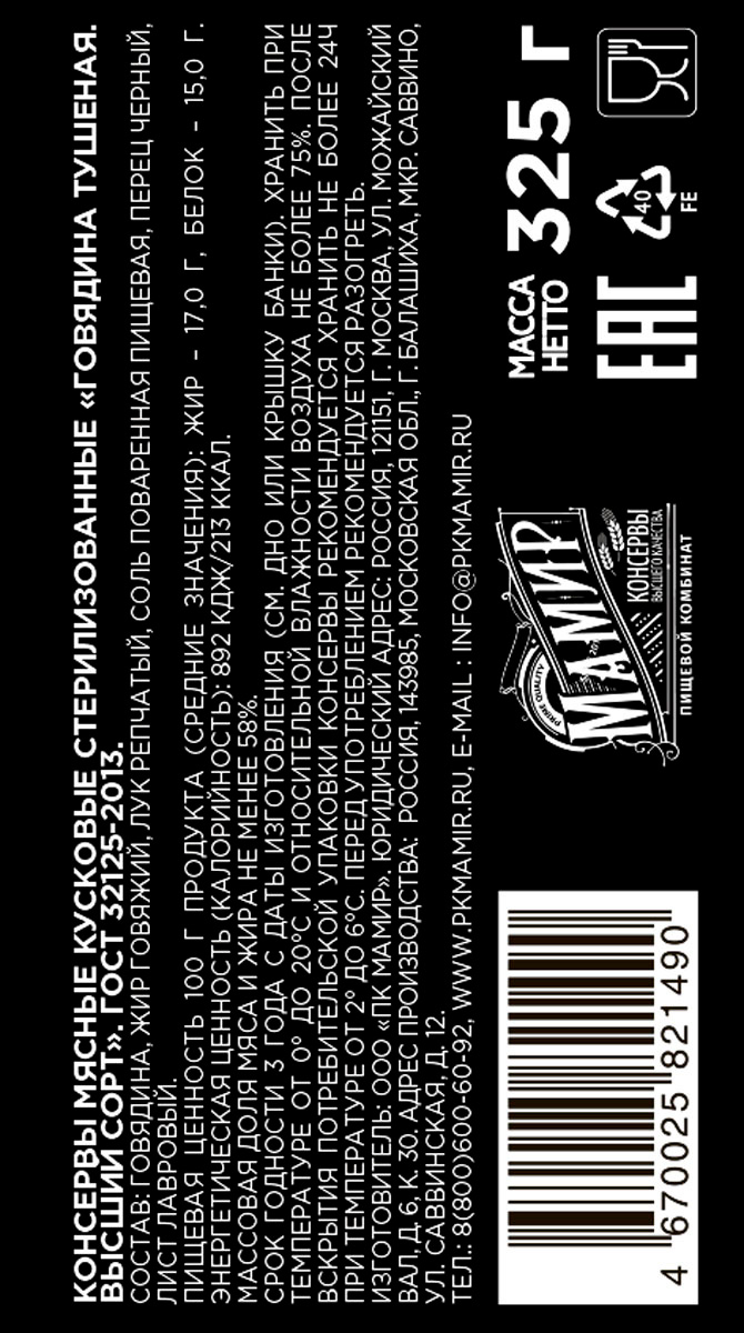 Говядина тушеная высший сорт ГОСТ 325 г