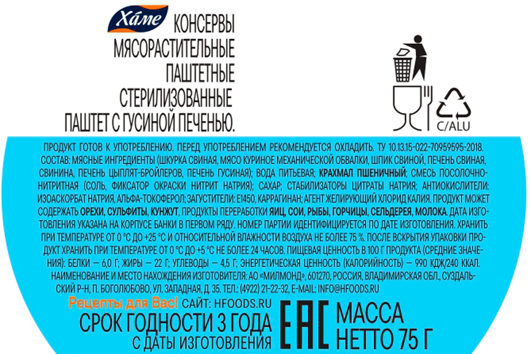 Классический паштет с гусиной печенью от бренда «Хаме» отлично подходит для семейного завтрака, перекуса в течение дня дома, на работе или в поездке, а также в качестве закуски для гостей. Достаточно просто открыть баночку и сервировать со свежим хлебом, тостами или хлебцами на ваш вкус. Паштеты «Хаме» — легко готовить, трудно оторваться!