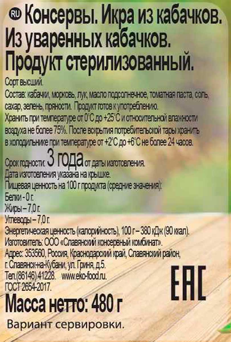 Кабачковая икра ЕKO произведена из натурального высококачественного сырья Краснодарского края по уникальному рецепту технологов предприятия. В состав продукта входит богатый набор витаминов и микроэлементов: натрий, кальций, магний, фосфор, медь и железо, набор органических кислот, витамины С, В1, В2. Консервы ЕКО — это вкусно и полезно!