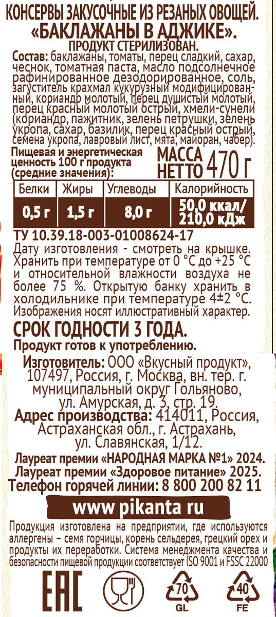 Баклажаны, печёные и заправленные аджикой, обладают мягким вкусом сочных томатов с приятной остринкой и аппетитным ароматом чеснока и пряностей. Могут служить готовой закуской или отлично дополнят другие блюда.