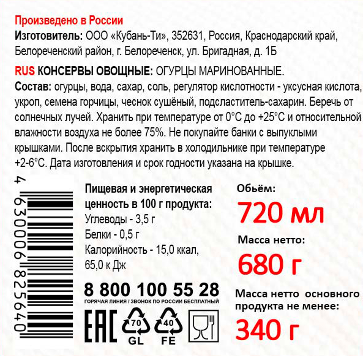 Для производства огурцов маринованных «Кубань Продукт» используются огурцы отборные, которые выращены на собственных полях с применением новейших технологий. Огромное внимание производители «Кубань Продукт» уделяют контролю качества выпускаемой продукции и осуществляют жесткий контроль всех этапов процесса производства.