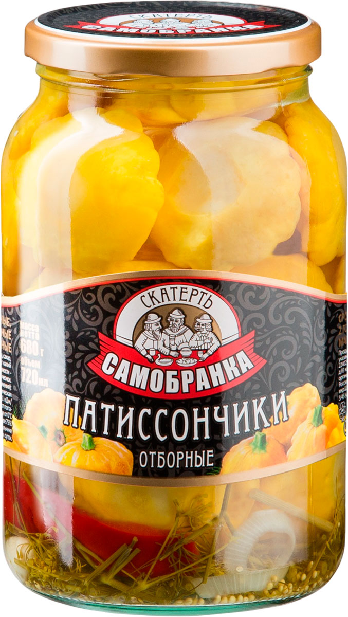 Маринованные патиссоны «Скатерть-Самобранка» нежно-желтого и белого цвета с тонкой шкуркой в маринаде. Имеют характерный, с типичной кислинкой, аромат консервированных овощей, подчеркнутый выразительными оттенками специй. Во вкусе выдержан баланс всех составляющих: самих патиссонов, укропа и пряностей. Готовое блюдо, которое не требует термической обработки.