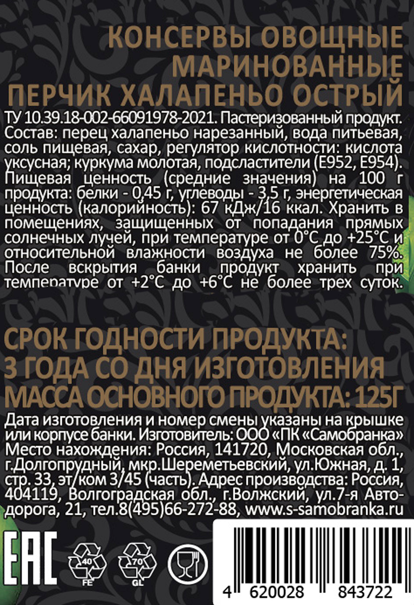 Перец халапеньо резаный «Скатерь-Самобранка» — это разновидность перца чили, который ценится за свои необычные вкусовые качества. Халапеньо добавляют в мясные блюда, пиццу и другие закуски, чтобы придать неповторимый аромат и вкус.