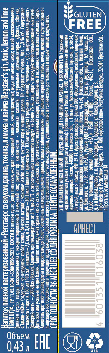 Напиток пивной Регстаерс джин тоник лимон лайм ж/б 0,43 л
